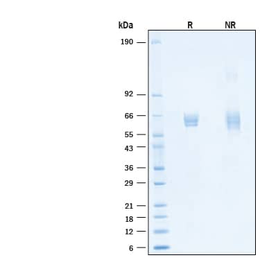 2 μg/lane of Recombinant Human Desmoglein‑3 His-tag Protein (Catalog # 11167-DM) was resolved with SDS-PAGE under reducing (R) and non-reducing (NR) conditions and visualized by Coomassie® Blue staining, showing bands at 57-67 kDa.