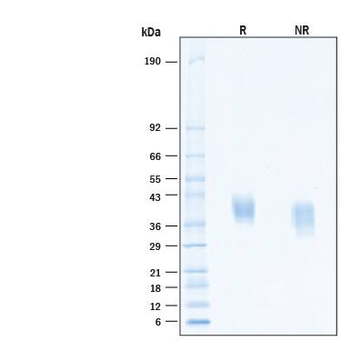 2 μg/lane of Recombinant Human Dkk‑1 Protein (Catalog # 11387-DK) was resolved with SDS-PAGE under reducing (R) and non-reducing (NR) conditions and visualized by Coomassie® Blue staining, showing bands at 38-42 kDa, under reducing conditions.