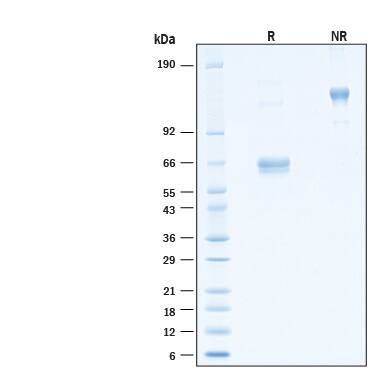 2 μg/lane of Recombinant Human EMMPRIN/CD147 Fc Chimera His-tag Alexa Fluor® 488 Protein (Catalog # AFG972) was resolved with SDS-PAGE under reducing (R) and non-reducing (NR) conditions and visualized by Coomassie® Blue staining, showing bands at 56-69 kDa and 112-140 kDa, respectively.Formulation, Preparation and Storage