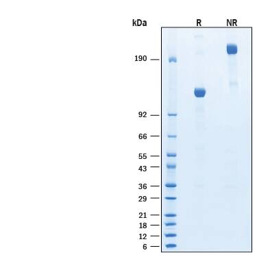 2 μg/lane of Biotinylated Recombinant Human ErbB2/Her2 Fc Chimera Protein (Catalog # BT1129) was resolved with SDS-PAGE under reducing (R) and non-reducing (NR) conditions and visualized by Coomassie® Blue staining, showing bands at 105-130 kDa and 210-260 kDa, respectively.Formulation, Preparation and Storage