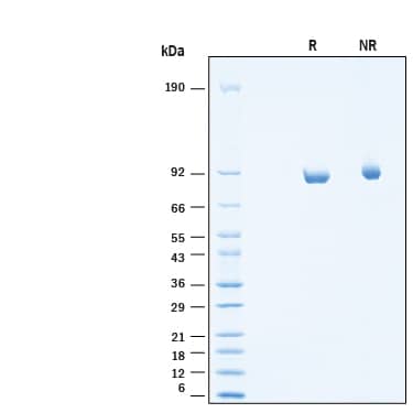 2 μg/lane of Recombinant Human FAP His-tag Protein (Catalog # 10921-SE) was resolved with SDS-PAGE under reducing (R) and non-reducing (NR) conditions and visualized by Coomassie® Blue staining, showing bands at 83-92 kDa.Formulation, Preparation and Storage