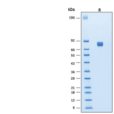 2 μg/lane of Recombinant Human FCRL3/FcRH3 His-tag Protein (Catalog # 11737-F3) was resolved with SDS-PAGE under reducing (R) condition and visualized by Coomassie® Blue staining, showing bands at 70-90 kDa.Formulation, Preparation and Storage