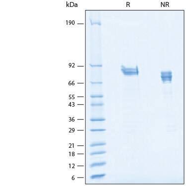 2 μg/lane of Recombinant Human FCRL3/FcRH3 His-tag Protein (Catalog # 3126-FCB) was resolved with SDS-PAGE under reducing (R) and non-reducing (NR) conditions and visualized by Coomassie® Blue staining, showing bands at 70-90 kDa.