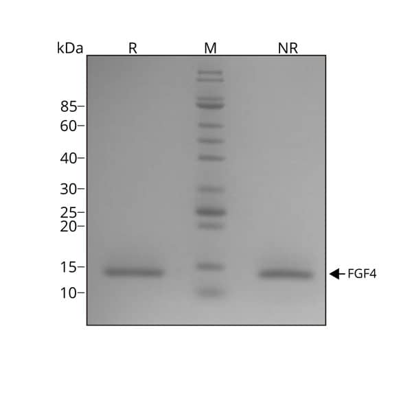 Recombinant human FGF-4 (Catalog # Qk004) migrates as a single band at 14 kDa in non-reducing conditions (NR) and upon reduction (R). No contaminating protein bands are visible.Purified recombinant protein (7 µg) was resolved using 15% w/v SDS-PAGE in reduced (+ beta-mercaptothanol, R) and non-reduced conditions (NR) and stained with Coomassie Brilliant Blue R250.