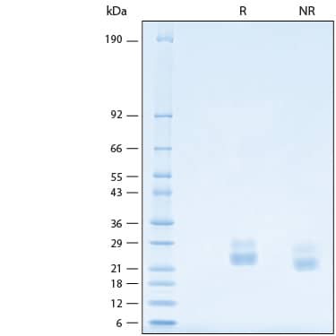 2 μg/lane of Recombinant Human Flt-3 Ligand/FLT3L (HEK293) Protein (Catalog # 308-FKHB) was resolved with SDS-PAGE under reducing (R) and non-reducing (NR) conditions and visualized by Coomassie® Blue staining, showing bands at 22-31 kDa.Formulation, Preparation and Storage