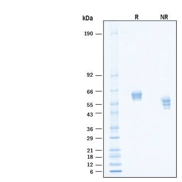 2 μg/lane of Recombinant Human GFR alpha‑1/GDNF R alpha‑1 His-tag Protein (Catalog # 11398-GR) was resolved with SDS-PAGE under reducing (R) and non-reducing (NR) conditions and visualized by Coomassie® Blue staining, showing bands at 51-64 kDa, under reducing conditions.