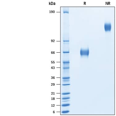 2 μg/lane of Recombinant Human GLP-1R Fc Chimera (Catalog # 10646-GL) was resolved with SDS-PAGE under reducing (R) and non-reducing (NR) conditions and visualized by Coomassie® Blue staining, showing bands at 60-72 kDa and 120-144 kDa, respectively.Formulation, Preparation and Storage