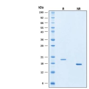 2 μg/lane of Recombinant Human IFN-alpha G/IFNA5 Protein (Catalog # 11017-IF) was resolved with SDS-PAGE under reducing (R) and non-reducing (NR) conditions and visualized by Coomassie® Blue staining, showing bands at 18-22 kDa.Formulation, Preparation and Storage