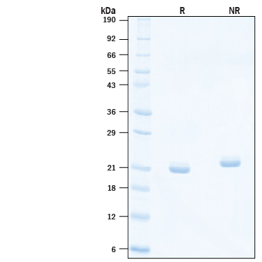 2 μg/lane of Recombinant Human IL-11 (CHO-expressed) Protein (Catalog # 10836-IL) was resolved with SDS-PAGE under reducing (R) and non-reducing (NR) conditions and visualized by Coomassie® Blue staining, showing bands at 20-23 kDa.Formulation, Preparation and Storage