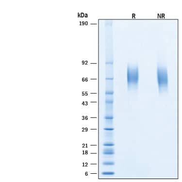 2 μg/lane of Recombinant Human IL-23R His-tag Protein (Catalog # 11408-IR) was resolved with SDS-PAGE under reducing (R) and non-reducing (NR) conditions and visualized by Coomassie® Blue staining, showing bands at 66-74 kDa, under reducing conditions.Formulation, Preparation and Storage