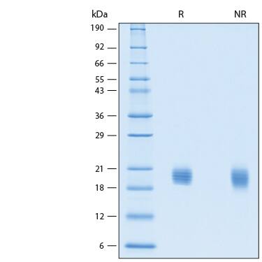 2 μg/lane of Recombinant Human IL-33 Biotinylated Protein (Catalog # BT3625) was resolved with SDS-PAGE under reducing (R) and non-reducing (NR) conditions and visualized by Coomassie® Blue staining, showing bands at 18-22 kDa.Formulation, Preparation and Storage