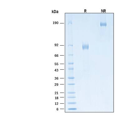 2 μg/lane of Biotinylated Recombinant Human IL-3R alpha/CD123 Fc Chimera Avi-tag Protein (Catalog # AVI11140) was resolved with SDS-PAGE under reducing (R) and non-reducing (NR) conditions and visualized by Coomassie® Blue staining, showing bands at 83-93 kDa and 170-190 kDa, respectively.