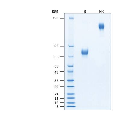 2 μg/lane of Biotinylated Recombinant Human IL-4R alpha Fc Chimera Protein (Catalog # BT7700) was resolved with SDS-PAGE under reducing (R) and non-reducing (NR) conditions and visualized by Coomassie® Blue staining, showing bands at 55-85 kDa, and 110-170 kDa, respectively.Formulation, Preparation and Storage