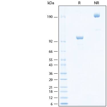 2 μg/lane of Recombinant Human LILRB1/CD85j/ILT2 Fc Chimera Biotinylated Protein (Catalog # BT2017) was resolved with SDS-PAGE under reducing (R) and non-reducing (NR) conditions and visualized by Coomassie® Blue staining, showing bands at 93-107 kDa and 190-210 kDa, respectively.Formulation, Preparation and Storage