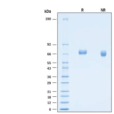2 μg/lane of Biotinylated Recombinant Human LILRB2/CD85d/ILT4 His-tag Avi-tag Protein (Catalog # AVI8429) was resolved with SDS-PAGE under reducing (R) and non-reducing (NR) conditions and visualized by Coomassie® Blue staining, showing bands at 65-75 kDa.