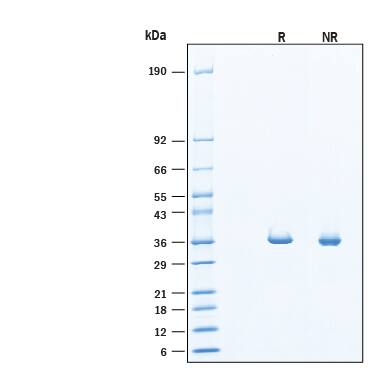 2 μg/lane of Recombinant Human MDH1 His-tag (Catalog # 11632-MH) was resolved with SDS-PAGE under reducing (R) and non-reducing (NR) conditions and visualized by Coomassie® Blue staining, showing bands at 35-38 kDa, under reducing conditions.Formulation, Preparation and Storage