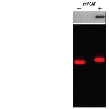 1 μg/lane of Recombinant Human MGAT2 His-tag (Catalog # 10711-GT) was resolved with SDS-PAGE under reducing (R) conditions and visualized by silver staining, showing bands at 46-54 kDa.Fluorescent gel mobility shift caused by rhMGAT2.