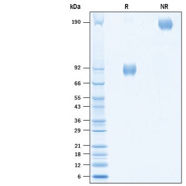 2 μg/lane of Biotinylated Human Nectin-1 Fc Chimera Avi-tag (Catalog # AVI10697) was resolved with SDS-PAGE under reducing (R) and non-reducing (NR) conditions and visualized by Coomassie® Blue staining, showing bands at 85-96 kDa and 160-190 kDa.Formulation, Preparation and Storage