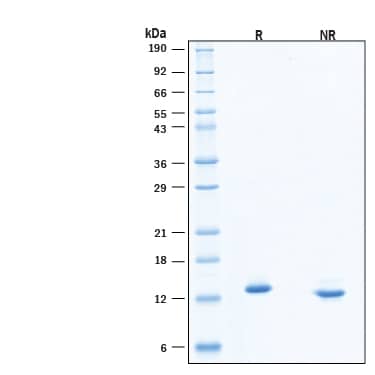 2 μg/lane of Recombinant Human NT‑3 Protein (Catalog # 11563-N3) was resolved with SDS-PAGE under reducing (R) and non-reducing (NR) conditions and visualized by Coomassie® Blue staining, showing bands at 12-15 kDa, under reducing conditions.Formulation, Preparation and Storage