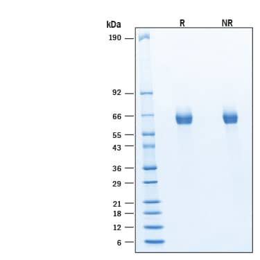 2 μg/lane of Recombinant Human Osteopontin/OPN-a His-tag Protein (Catalog # 11437-OP) was resolved with SDS-PAGE under reducing (R) and non-reducing (NR) conditions and visualized by Coomassie® Blue staining, showing bands at 60-66 kDa, under reducing conditions.