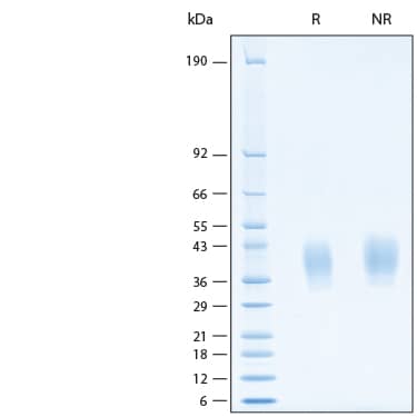 2 μg/lane of Recombinant Human PD-L2/B7-DC His Alexa Fluor® 488 Protein (Catalog # AFG9075) was resolved with SDS-PAGE under reducing (R) and non-reducing (NR) conditions and visualized by Coomassie® Blue staining, showing bands at 29-47 kDa.Formulation, Preparation and Storage