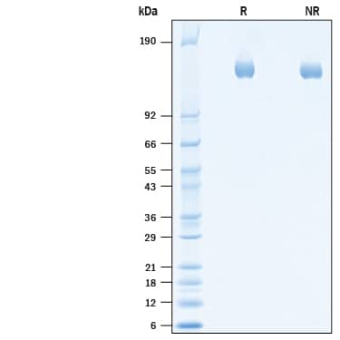 2 μg/lane of Recombinant Human Plexin A1 His-tag (Catalog # 10167-PA) was resolved with SDS-PAGE under reducing (R) and non-reducing (NR) conditions and visualized by Coomassie® Blue staining, showing bands at 130-150 kDa...Formulation, Preparation and Storage