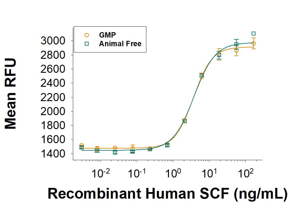 GMP-grade Recombinant Human SCF (Catalog # 255B-GMP) stimulates cell proliferation of the TF‑1 human erythroleukemic cell line. The ED50 for this effect is 1-5 ng/mL. Four independent lots were tested for activity and plotted on the same graph to show lot-to-lot consistency of GMP SCF.Equivalent Bioactivity of GMP and Animal-Free grades of Recombinant Human SCF