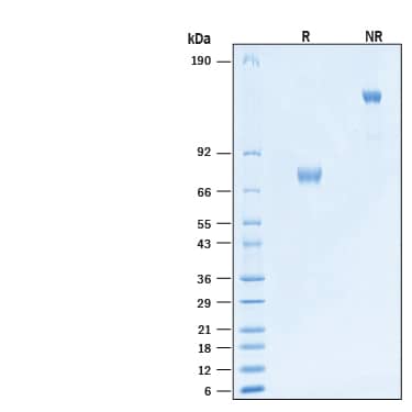 2 μg/lane of Recombinant Human Siglec-3/CD33 Fc Alexa Fluor® 488 Protein (Catalog # AFG1137) was resolved with SDS-PAGE under reducing (R) and non-reducing (NR) conditions and visualized by Coomassie® Blue staining, showing bands at 67-85 kDa and 130-170 kDa, respectively.Formulation, Preparation and Storage