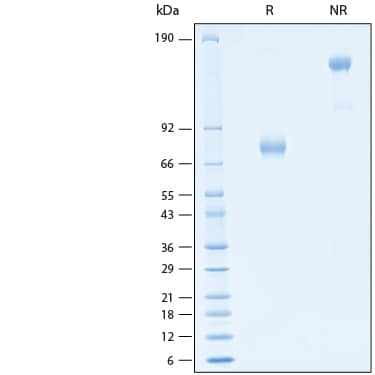 2 μg/lane of Recombinant Human Siglec‑3/CD33 Fc Chimera Alexa Fluor® 647 Protein (Catalog # AFR1137) was resolved with SDS-PAGE under reducing (R) and non-reducing (NR) conditions and visualized by Coomassie® Blue staining, showing bands at 67-85 kDa.Formulation, Preparation and Storage