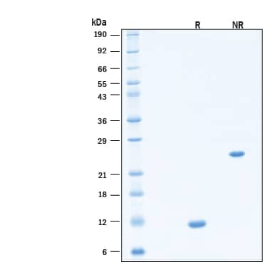 2 μg/lane of Recombinant Human TGF‑ beta1 (CHO-Expressed) Protein (Catalog # 11409-BH) was resolved with SDS-PAGE under reducing (R) and non-reducing (NR) conditions and visualized by Coomassie® Blue staining, showing bands at 12 kDa, under reducing conditions & 24 kDa under non-reducing conditions.Affinity Measurements and Binding Kinetics of the Interaction between TGF-beta RII and TGF beta1 by SPR