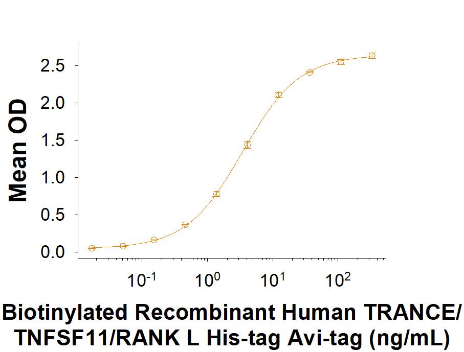 When Recombinant Human RANK/TNFRSF11A Fc Chimera Protein (Catalog # 683-RK) is coated at 0.5 μg/mL (100 μL/well), the concentration of Biotinylated Recombinant Human TRANCE/TNFSF11/RANK L His-tag Avi-tag that produces 50% optimal binding response is 3.00-15.0 ng/mL
