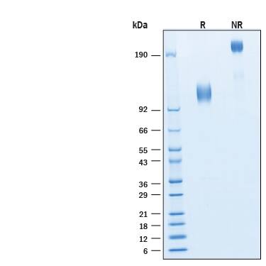 2 μg/lane of Biotinylated Recombinant Human TrkB Fc Chimera Avi-tag Protein (Catalog # AVI11645) was resolved with SDS-PAGE under reducing (R) and non-reducing (NR) conditions and visualized by Coomassie® Blue staining, showing bands at 106-120 kDa and 212-240 kDa, respectively.