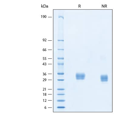 2 μg/lane of Recombinant Human ULBP-2 His-tag Protein (Catalog # 11196-UL) was resolved with SDS-PAGE under reducing (R) and non-reducing (NR) conditions and visualized by Coomassie® Blue staining, showing bands at 25-35 kDa.