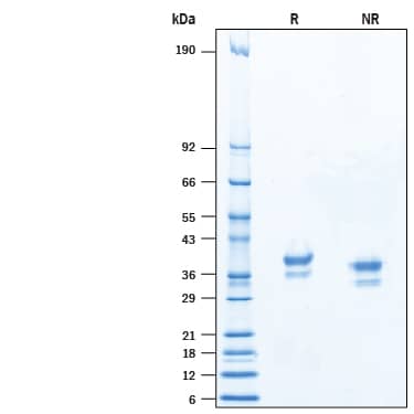 2 μg/lane of Recombinant Human VSIG3 His-tag (Catalog # 10806-VS) was resolved with SDS-PAGE under reducing (R) and non-reducing (NR) conditions and visualized by Coomassie® Blue staining, showing bands at 32-41 kDa.Formulation, Preparation and Storage