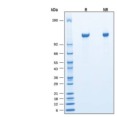 2 μg/lane of Recombinant Mouse Agrin His-tag Protein (Catalog # 11573-AG) was resolved with SDS-PAGE under reducing (R) and non-reducing (NR) conditions and visualized by Coomassie® Blue staining, showing bands at 114-128 kDa under reducing conditions.Formulation, Preparation and Storage