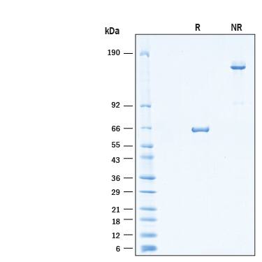 2 μg/lane of Recombinant Mouse CD300f/LMIR3 Fc Chimera Protein (Catalog # 10967-LM) was resolved with SDS-PAGE under reducing (R) and non-reducing (NR) conditions and visualized by Coomassie® Blue staining, showing bands at 55-65 kDa and 110-130 kDa, respectively.