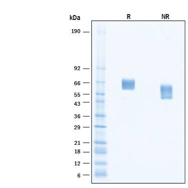 2 μg/lane of Recombinant Mouse MuSK His-tag Protein (Catalog # 11519-MK) was resolved with SDS-PAGE under reducing (R) and non-reducing (NR) conditions and visualized by Coomassie® Blue staining, showing bands at 63 - 69 kDa.