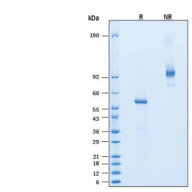 2 μg/lane of Recombinant Mouse R‑Spondin 1 Fc Chimera Protein (Catalog # 11566-RS) was resolved with SDS-PAGE under reducing (R) and non-reducing (NR) conditions and visualized by Coomassie® Blue staining, showing bands at SDS-PAGE 57-63 kDa and 110-130 kDa, respectively.Formulation, Preparation and Storage