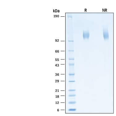 2 μg/lane of Recombinant SARS-CoV-2 B.1.351 Spike S1 Subunit His-tag Protein (Catalog # 11133-CV) was resolved with SDS-PAGE under reducing (R) and non-reducing (NR) conditions and visualized by Coomassie® Blue staining, showing bands at 102-112 kDa.Formulation, Preparation and Storage