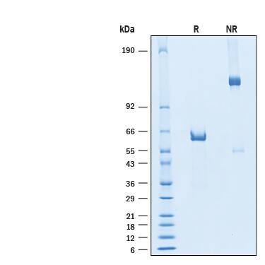 2 μg/lane of Recombinant SARS-CoV-2 BA.2 Spike RBD Fc Chimera Protein (Catalog # 11148-CV) was resolved with SDS-PAGE under reducing (R) and non-reducing (NR) conditions and visualized by Coomassie® Blue staining, showing bands at 59-65 kDa.Formulation, Preparation and Storage