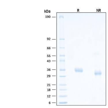2 μg/lane of Recombinant SARS-CoV-2 C.37 Spike RBD His-tag Protein (Catalog # 10880-CV) was resolved with SDS-PAGE under reducing (R) and non-reducing (NR) conditions and visualized by Coomassie® Blue staining, showing bands at 32-38 kDa.