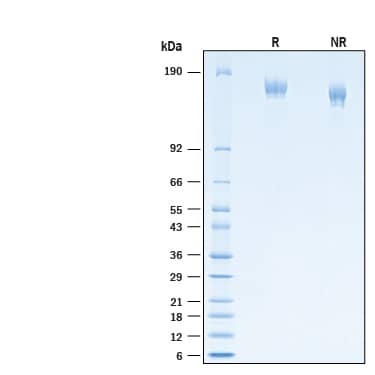 2 μg/lane of Recombinant SARS-CoV-2 P.1 Spike (GCN4-IZ) His-tag Alexa Fluor® 647 Protein (Catalog # AFR10795) was resolved with SDS-PAGE under reducing (R) and non-reducing (NR) conditions and visualized by Coomassie® Blue staining, showing bands at 140-170 kDa.