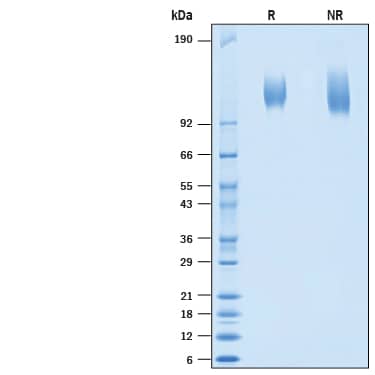 2 μg/lane of Recombinant SARS-CoV-2 Spike S1 Subunit His-tag (Catalog # 10693-CV) was resolved with SDS-PAGE under reducing (R) and non-reducing (NR) conditions and visualized by Coomassie® Blue staining, showing bands at 105-125 kDa.Formulation, Preparation and Storage