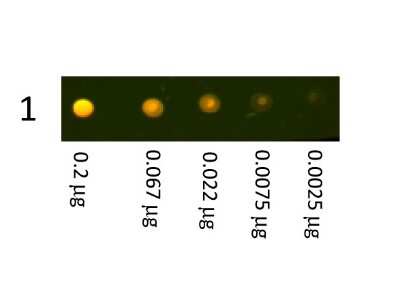 Dot Blot: Donkey anti-Rabbit IgG (H+L) Secondary Antibody [Texas Red] [NB120-6800] - Dot Blot showing the detection of Rabbit IgG using Donkey anti-Rabbit IgG (H+L) Secondary Antibody [Texas Red]. A three-fold serial dilution of Rabbit IgG starting at 200ng was spotted onto 0.45 um nitrocellulose. After blocking in 5% western blot blocking reagent