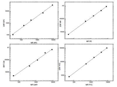 The relative number of fluorophores can been determined for every emission peak of the rainbow calibration particles in FL1 (FITC, MEFL), FL2 (RPE, MEPE), FL3 (RPE-Cy5, MEPCY) and FL4 (APC, MEAP) channels in order to plot the calibration graph. The calibration graph is used to check the linearity (dynamic range) of the photomultiplier tube (PMT) in each channel. Additionally, the relative number of fluorophores can be cross calibrated with cells or particles stained with a known number of spectral matching fluorophores such as FITC, PE, RPE-Cy5 to estimate the number of fluorophores on stained cells.
