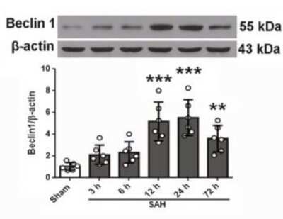 Western Blot: Beclin 1 Antibody - BSA Free [NB500-249] - Fucoxanthin activated autophagy after TBI.(A) Representative images of immunofluorescence for LC3 surrounding the injured cortex. LC3 punctate dots were observed in the cytoplasm by immunofluorescent staining of LC3 (red). Neuron cells & nuclei are labeled with NeuN (green) & DAPI (blue), respectively. Magnification: 40 x. Scale bar: 50 mm. (B) Mice brain tissues were collected 1 day after TBI in different groups, & the expression of LC3, Beclin-1 & p62 was measured by western blot. Fucoxanthin treatment significantly increased the level of LC3-II & Beclin-1 while decreasing the level of p62 after TBI. (C) 3-MA (400 nM) was injected i.c.v. 30 min before TBI. Mice were then subjected to TBI & treatment of fucoxanthin 30 min after TBI. Pretreatment with 3-MA significantly attenuated fucoxanthin-induced activation of autophagy & suppression of apoptosis & oxidative stress in the ipsilateral cortex. Data are presented as mean ± SEM, n = 6 per group; **p < 0.01, ***p < 0.001 versus sham group; #p < 0.05, ##p < 0.01 versus TBI + vehicle group; &&p < 0.01, &&&p < 0.001 versus TBI + fucoxanthin group. beta-actin was used as a loading control. Image collected & cropped by CiteAb from the following publication (https://pubmed.ncbi.nlm.nih.gov/28429775), licensed under a CC-BY license. Not internally tested by Novus Biologicals.