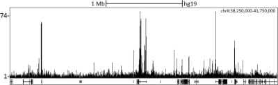 Chromatin Immunoprecipitation Sequencing: CHD1 Antibody [NB100-60411] - Localization of CHD1 Binding Sites by ChIP-sequencing. Chromatin from K562 cells was immunoprecipitated with anti-CHD1 antibody NB100-60411 and analyzed by DNA sequencing. The figure illustrates the peak distribution of CHD1 binding within a 3.5 Mb region of the human X chromosome as detected using anti-CHD1 antibody NB100-60411. ChIP-seq validation performed by Diogenode, Denville, NJ.