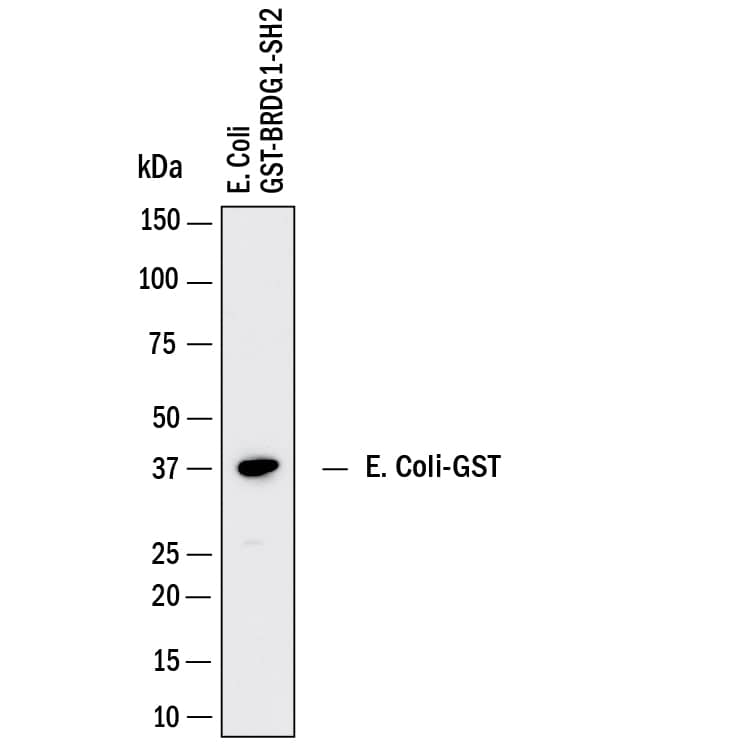 Western Blot shows lysates of E. coli transfected with GST tagged BRDG1-SH2. PVDF membrane was probed with 0.5 µg/ml of Hamster Anti-Glutathione S-Transferase/GST Monoclonal Antibody (Catalog # MAB94991) followed by HRP-conjugated Anti-Hamster IgG Secondary Antibody. A specific band was detected for Glutathione S-Transferase/GST at approximately 37 kDa (as indicated). This experiment was conducted under reducing conditions and using Western Blot Buffer Group 1.Applications for Glutathione S-Transferase/GST Antibody