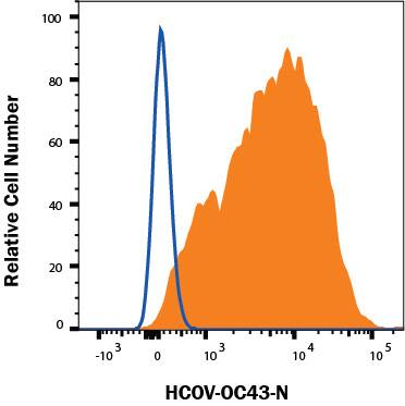 HEK293 cells transfected with HCOV-OC43-N or HEK293 cells transfected with an irrelevant protein were stained with Mouse Anti-HCoV-OC43 Nucleocapsid Monoclonal Antibody (Catalog # MAB11289, filled histogram) or isotype control antibody (Catalog # MAB002, open histogram), followed by Allophycocyanin-conjugated Anti-Mouse IgG Secondary Antibody (Catalog # F0101B). View our protocol for Staining Membrane-associated Proteins.Applications for HCoV-OC43 Nucleocapsid Antibody