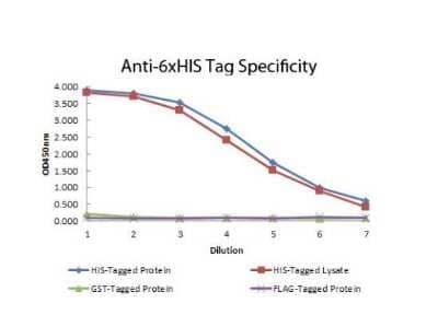 ELISA: His Tag Antibody (33D10.D2.G8) [HRP] [NBP1-42783] - ELISA of Mouse anti-6xHIS Tag Antibody. Antigen: HIS-tagged purified protein and E. coli cell lysates expressing HIS-Tagged construct, GST- and RON-tagged purified proteins. Coating amount: 0.15 ug per well. Primary antibody: 6xHIS Tag antibody at 100 ug/mL. Dilution series: 2-fold. Mid-point concentration: 200 ng/mL. Secondary antibody: Peroxidase mouse secondary antibody at 1:10,000.